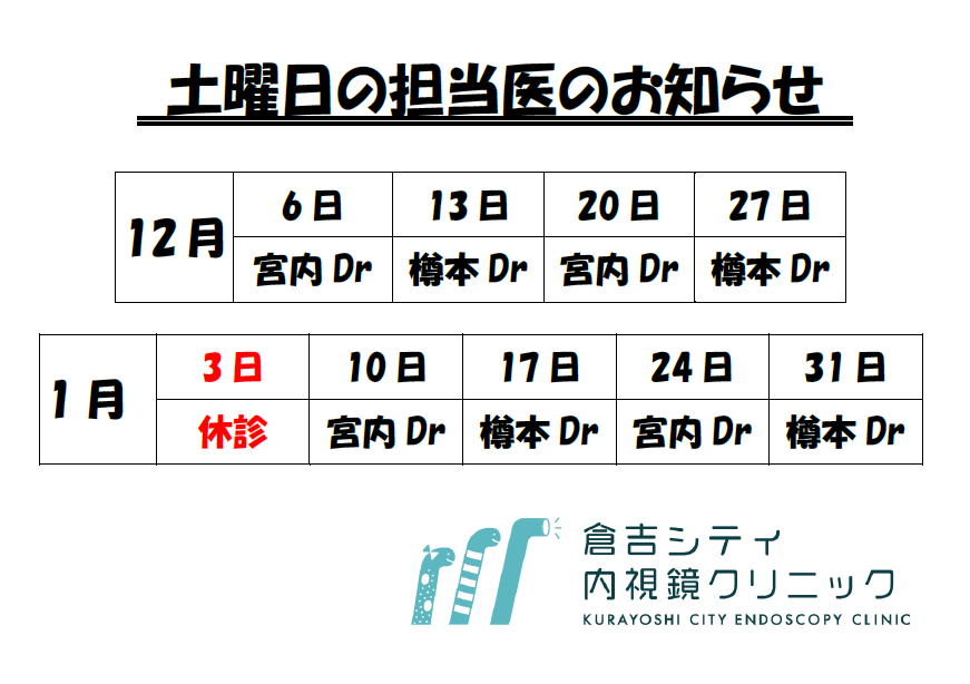 12月、1月の土曜日担当医のお知らせをいたします。